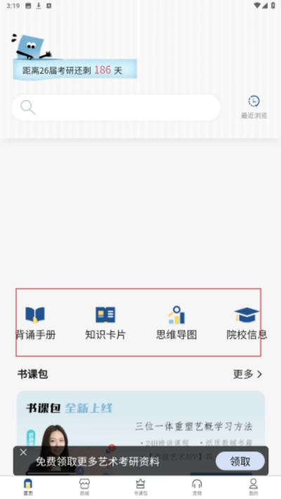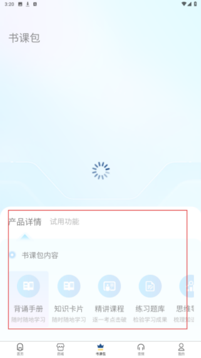 2、在书课包页面中可结合背诵手册与知识卡片等学习资源,开展系统化知识学习与记忆训练。