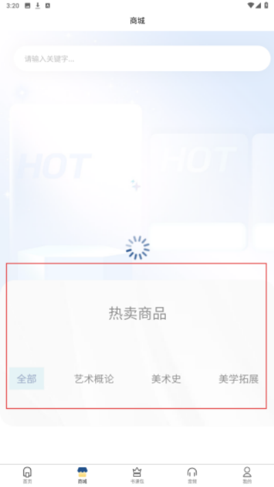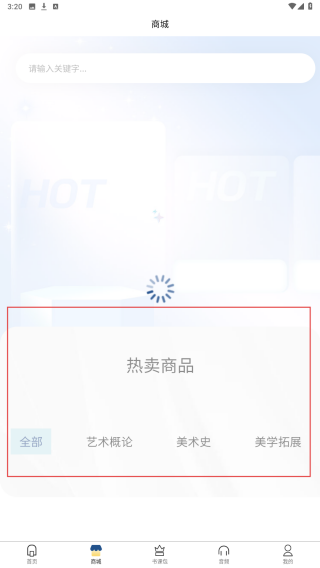 3、进入商城页面后可浏览热卖商品,并通过全部或艺术概论等分类筛选所需学习相关内容与资料。