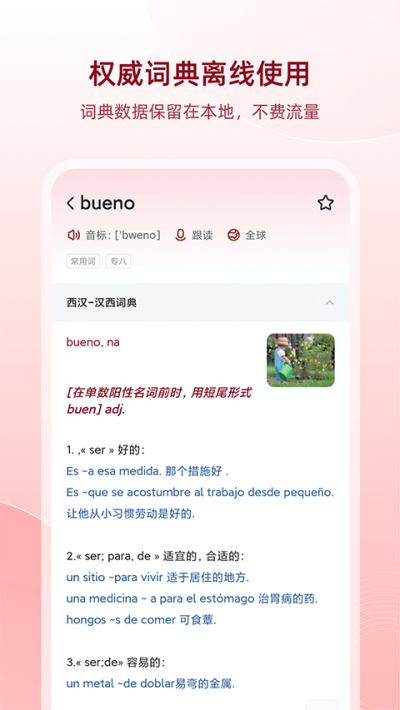 西语助手专注西班牙语学习与查阅,收录海量西汉、汉西核心词条,支持额外词库下载扩充词汇储备。软件配备标准真人原声发音,解决口语朗读难题,自带智能输入纠错功能,优化日常拼写输入体验。内置生词本云端同步服务,跨设备接续学习进度,同时结合例句拓展、考试真题、动词变位查询、词根解析等实用内容,满足日常翻译、背诵积累、备考刷题等多样化学习需求。
